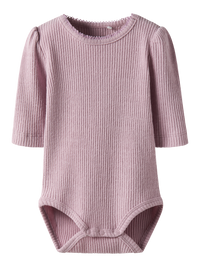 Denne body er lavet i en blød og elastisk ribstrikket kvalitet, som har et fint, lodret stribet mønster med glimmer og sikrer god bevægelsesfrihed for dit barn. Bodyen har lange ærmer og en rund hals, hvilket gør den ideel til at holde den lille varm og komfortabel i de kolde måneder. Det naturlige valg af materialer giver en behagelig pasform og sikrer et tidløst look, perfekt til babyens garderobe året rundt.