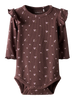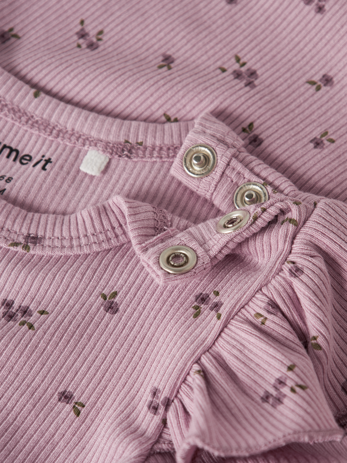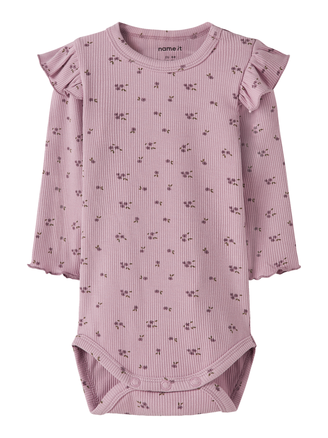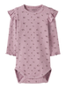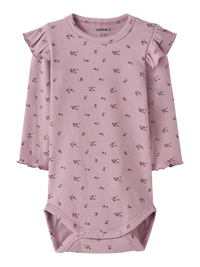 Den bløde body er lavet i ribstrik med et lodret mønster, som både giver god elasticitet og sikrer en behagelig pasform med et tidløst udtryk. Bodyen har rund hals og lange ærmer, som lukkes med trykknapper, hvilket gør den nem at tage af og på. Fine flæsedetaljer tilføjer et sødt, feminint touch.