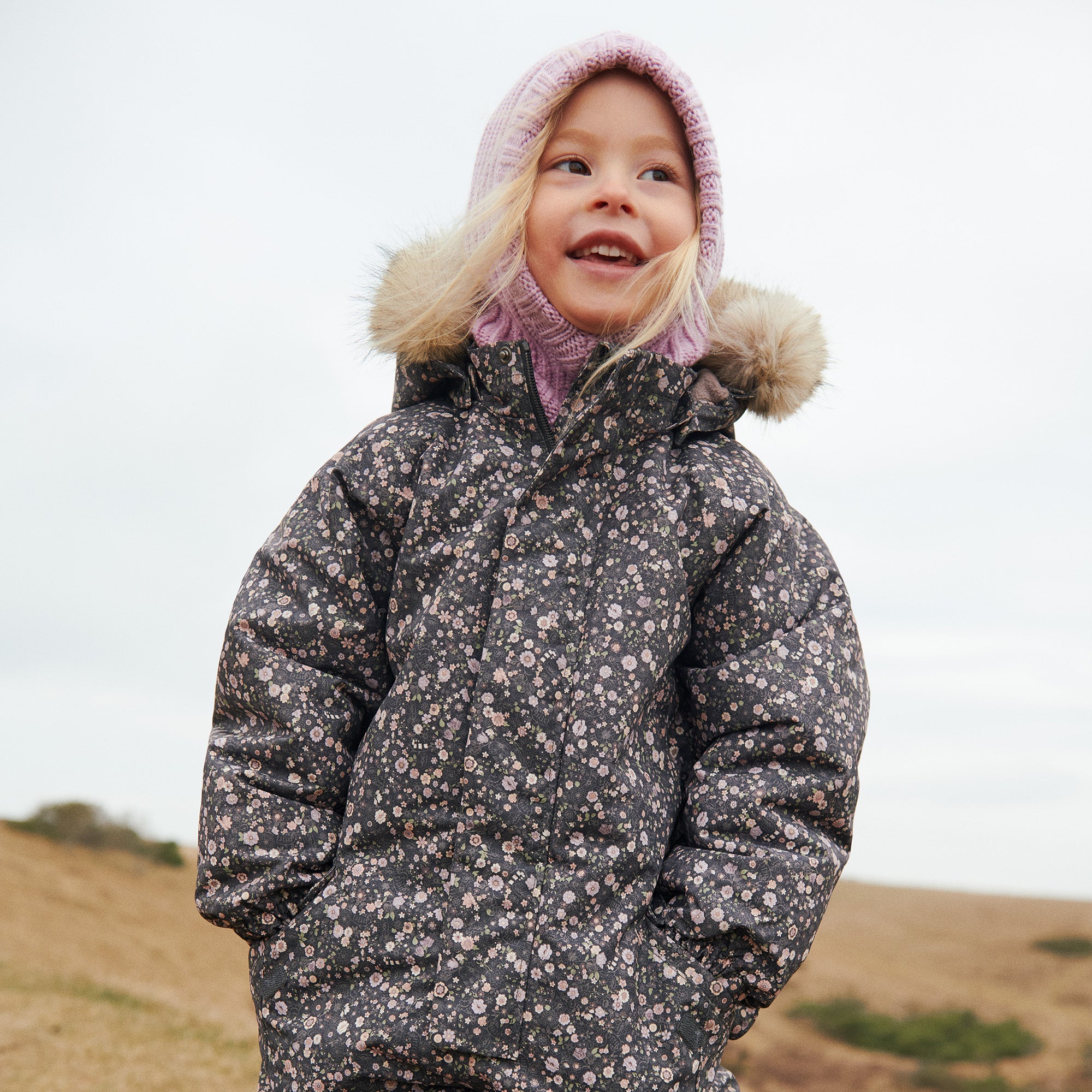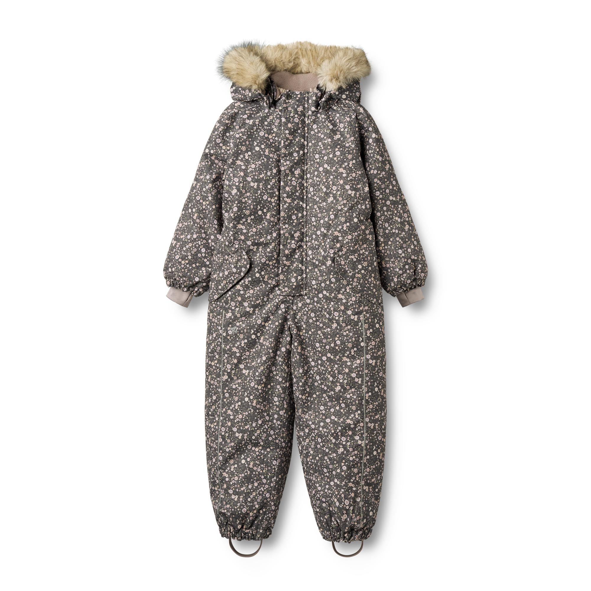 Dragten har mange praktiske detaljer såsom aftagelig og justerbar hætte, stormmanchetter og justerbare gummistropper under fødderne. Den har også indsyet elastiske seler, som giver dit barn mulighed for at have dragten halvt af med armene fri, hvis dit barn bliver varm eller er indenfor for en stund.