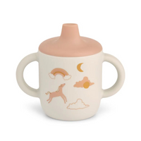Liewood Neil-koppen er perfekt til at lære at drikke af en kop. Koppen har aftageligt låg med en lille drikketud, og de bløde håndtag sikrer giver et godt greb, så barnet kan øve sig i at holde og vippe koppen som forberedelse til at bruge en åben kop.
