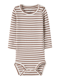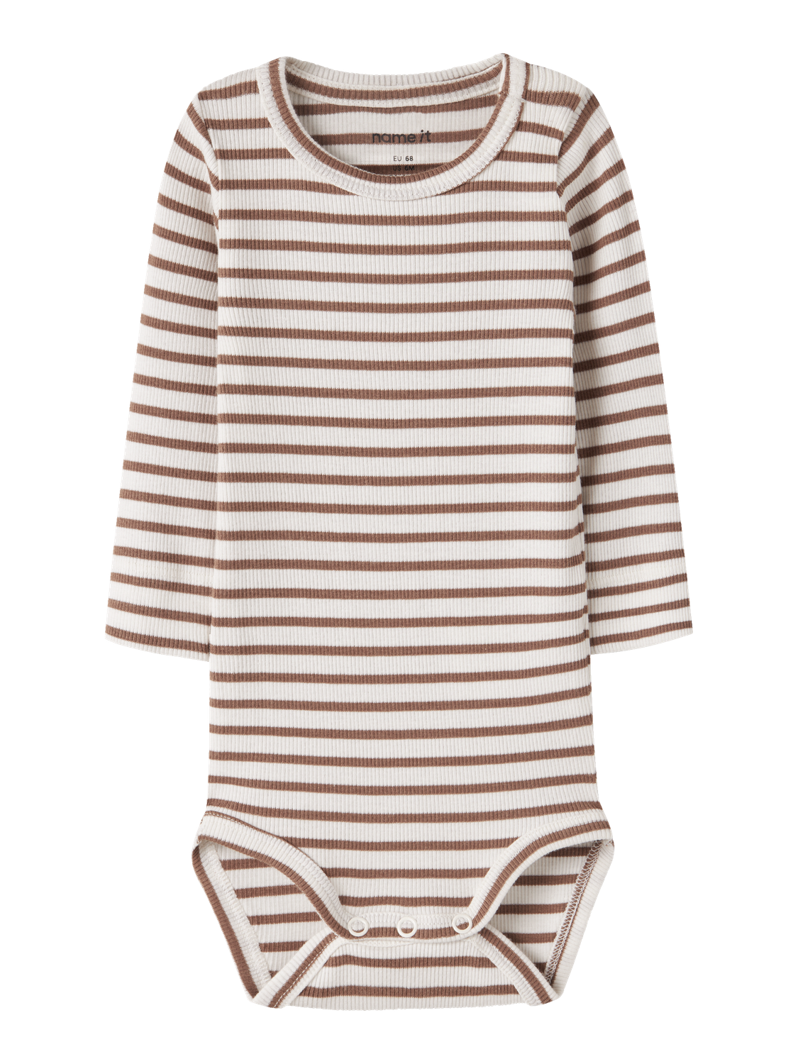 Denne body er lavet i en blød ribstrikket kvalitet, der giver en behagelig pasform og et tidløst udseende takket være det vertikale stribemønster og den gode elasticitet. Med rund hals og lange ærmer er den ideel til den nyfødte, og materialerne sørger for, at den er både komfortabel og bæredygtig.
