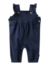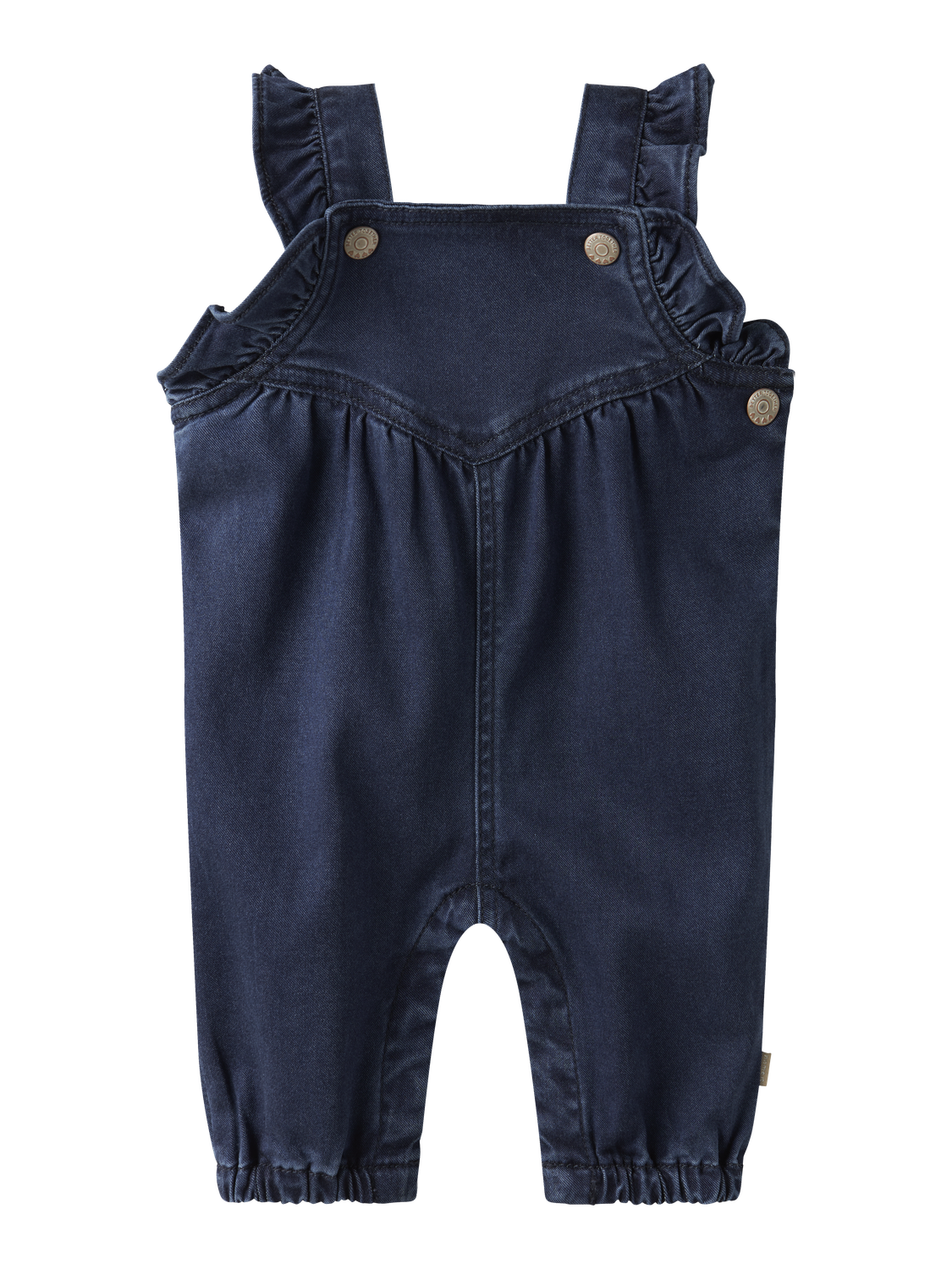 Name it denim-overalls til nyfødte kombinerer komfort og holdbarhed med et moderne look. Materialerne er nøje udvalgt for at give blødhed og bevægelsesfrihed, blandt andet ved brug af LENZING™ TENCEL™ Lyocell, genanvendt polyester og viscose, hvilket sikrer både bæredygtighed og kvalitet. Overallsens elastiske læg sikrer en behagelig pasform, og trykknaplukningen gør den nem at tage af og på. Denimstoffet er slidstærkt med et unikt udtryk skabt gennem subtile slideeffekter.
