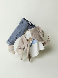 Disse cordbukser har et blødt, fløjlsagtigt ribstof, som gør dem behagelige at have på. Bukserne har en smal pasform med let bumset hofte og taperede ben, der giver god bevægelsesfrihed til de mindste. Med elastik og justerbar talje sikres en god pasform, og de praktiske lommer tilføjer funktionalitet.
