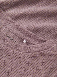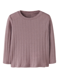 Langærmet top til piger i en behagelig ribstrikket kvalitet med en let stribet og elastisk struktur, der sikrer god bevægelsesfrihed og en tidløs stil. Farven Toadstool er en blød nuance af lys lilla, perfekt til efterårssæsonen. Denne trøje er designet til at give varme og komfort hele dagen, ideel til køligere vejr.