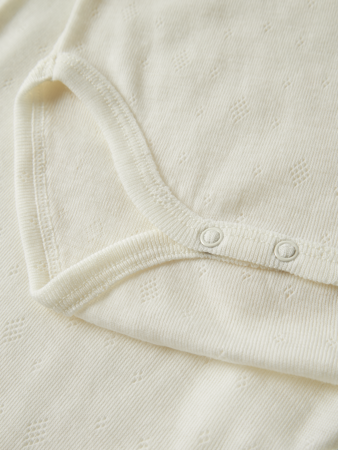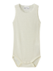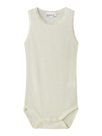 Name it body til børn er lavet i blød merinould, som sikrer en behagelig og varm pasform uden at gå på kompromis med komfort. Den er uden ærmer og har en rund hals, der giver et klassisk og enkelt udtryk. Bodysuiten lukkes med trykknapper i skridtet, hvilket gør den nem at tage af og på. Det fine blonde-detalje tilfører et sødt og feminint touch til designet. Det unikke nålefald i strikken skaber et mønster med løse masker, der giver et karakteristisk og charmerende udseende.