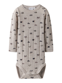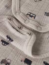 Denne uldbody i Merinould er blød og behagelig for de mindste. Den er designet med lange ærmer og rund hals, og lukkes nemt med trykknapper for praktisk påklædning. Stoffet har et fint all-over print med små biler, som giver et sødt og unikt udtryk. Den lysegrå nuance kaldet Nacreous Cloud passer godt til mange forskellige sæt tøj.