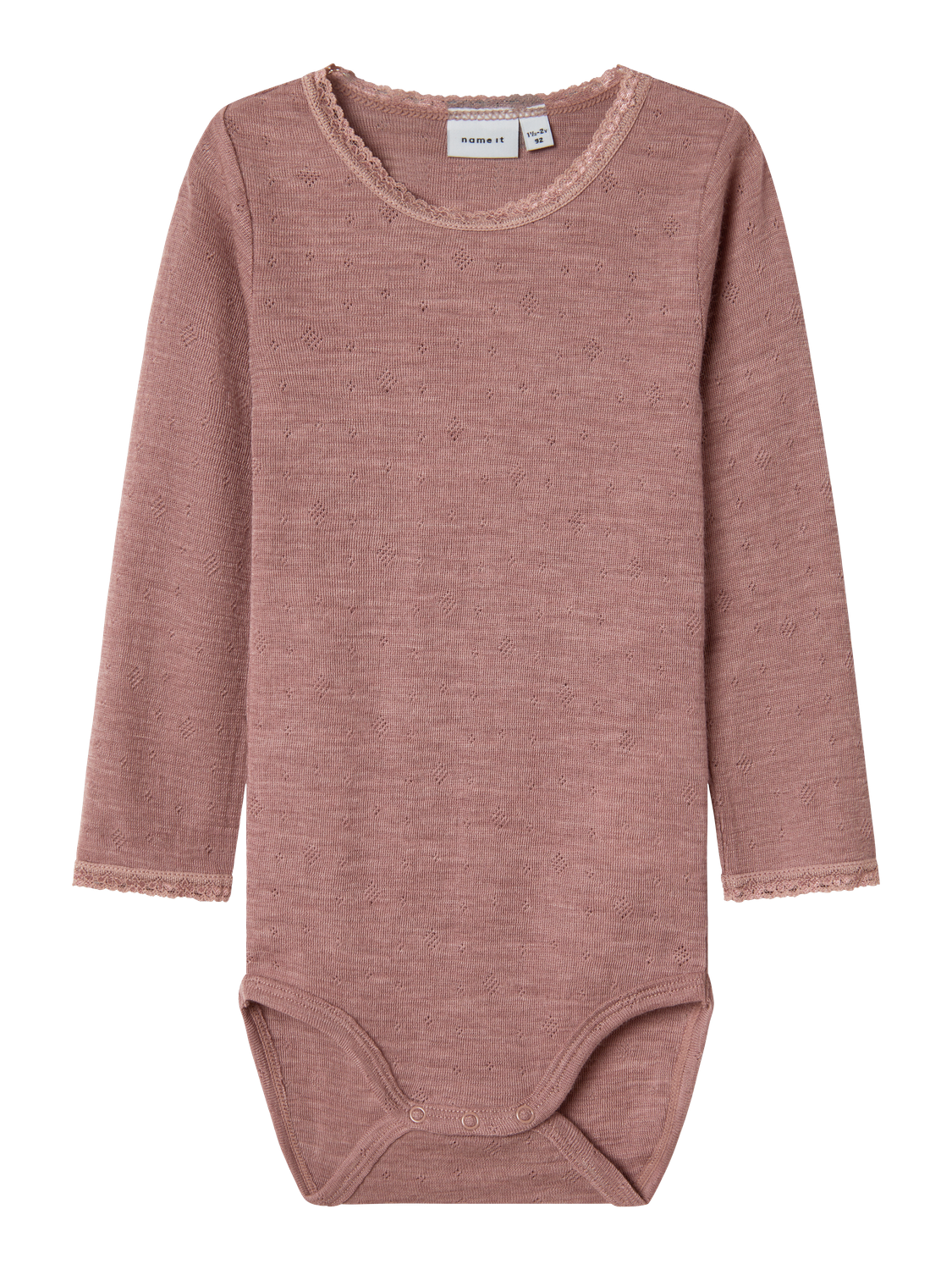 Bodyet i merinould kombinerer blødhed med varme og har lange ærmer og rund hals, perfekt til de kølige efterårsdage. Det unikke needle drop-design giver mønstre med faldne masker, der skaber et charmerende udtryk. Derudover er der en fin blonde detalje, som tilføjer et feminint touch. Lukningen med trykknapper i skridtet gør det nemt at tage på og af.
