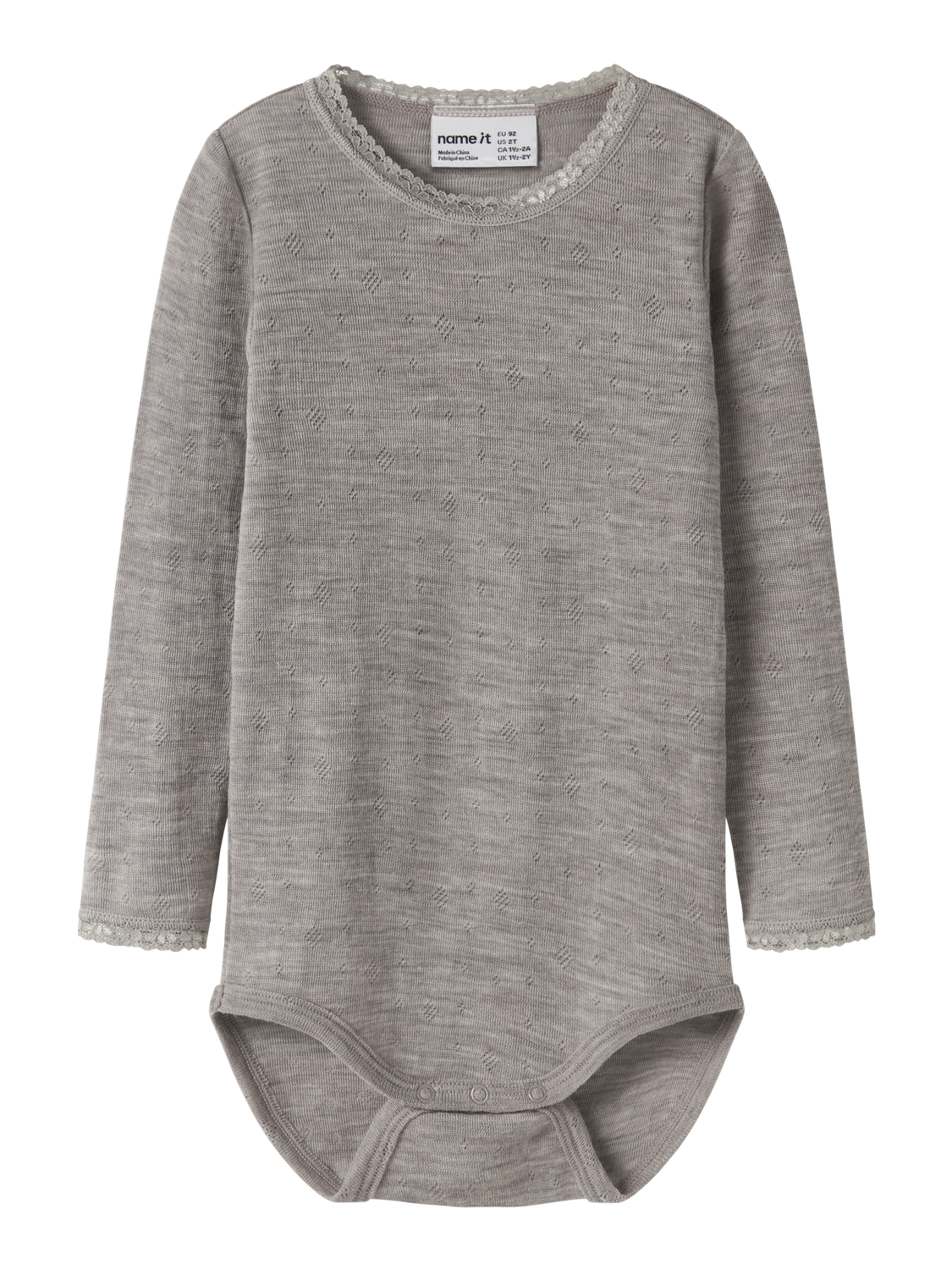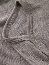 Denne bodystocking i blød merinould er designet til små piger og kombinerer komfort med et sødt, unikt udtryk takket være needle drop-teknikken, der skaber fine mønstre med dropped stitches. Den har en rund halsudskæring og lange ærmer, som gør den perfekt til køligere efterårsdage. En fin blondekant tilfører et feminint touch, mens trykknapper i skridtet gør det nemt at tage bodystockingen af og på.