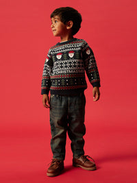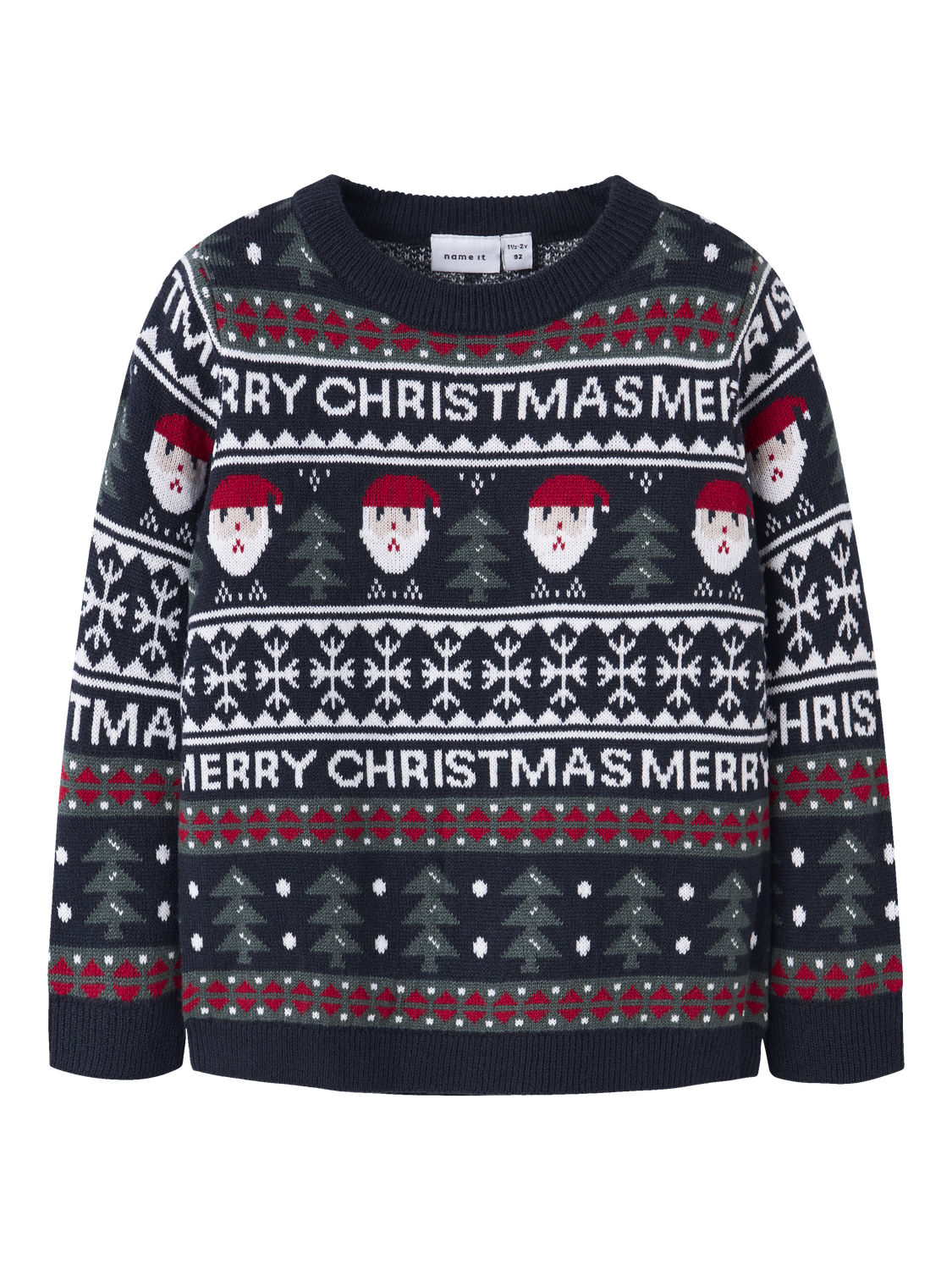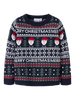 Name it strikkede julepullover til børn har et tidløst design med en detaljeret jacquardstruktur, der giver en struktureret og klassisk følelse. Den har lange ærmer, ribbede manchetter og en rund hals, som samlet skaber en behagelig pasform, der passer til daglig brug i vintermånederne. Den dybe og mørke blå farve, kaldet Dark sapphire, tilfører et stilfuldt og alsidigt look.