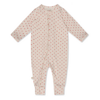 That's Mine Elliotte heldragt er lavet i blødt økologisk bomuld og modal. Den har et smukt print. Heldragten er lavet meget praktisk med tovejs lynlås, så det er nemt når du fx skal skifte ble og kan lyne den op fra bunden.
