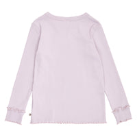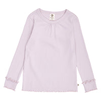 Müsli langærmet bluse i blød og strækbar rib. Blusen har fine ruflede detaljer ved ærmeafslutning og er sød og feminin i sit udtryk. Fremstillet i blød og strækbar 2x2 bomulds rib med elastan.