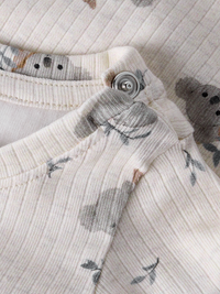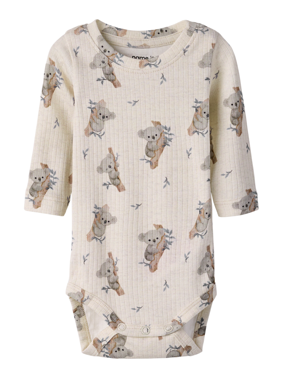 Denne body er designet til babyer. Den har rund hals og lange ærmer, hvilket sikrer komfort og bevægelsesfrihed. Den har trykknapper både ved skridtet og på skulderen, så det er nemt at tage den af og på. Stoffet er ribstrikket med et lodret, stribet mønster, som både giver god elasticitet og et klassisk look.