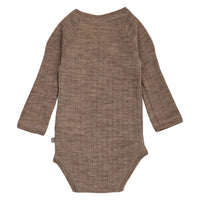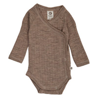 Müsli body i blød merinould rib med krydslukning. Bodyen kan åbnes helt op fortil med tryklåse så bodyen ikke skal ned over hovedet på baby. Bodyen har ydermere tryklåse i bunden. Denne body er lavet fra str. 44-74 og passer derfor til helt små babyer. Fremstillet i dejlig blød merinould-rib som ikke kradser. Uld er varmeregulerende og har den evne at den holder tør og varm da uld transporterer sved væk fra kroppen.