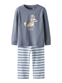Gør sengetid sjovere for dit barn med dette bløde og behagelige natdragtssæt, der sikrer en god nats søvn. Sættet er lavet i jersey, et let og elastisk stof med en blød overflade, som giver både komfort og bevægelsesfrihed. Natdragten har lange ærmer og kommer i en dæmpet flint-sten blå farve, der passer til vinterens kolde måneder.