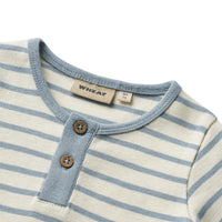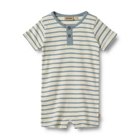 Wheat sommerdragt Alfred i blød og lækker økologisk bomuld. Den har korte ærmer og stolpelukning foran med to små knapper samt trykknapper i benene.