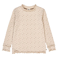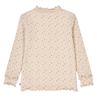 Müsli bluse med lange ærmer og i et smukt gennemgående blomsterprint. Kraven er med en sød og dekorativ flæsekant. Fremstillet i en dejlig blød og strækbar 2x2 rib med elastan for at sikre en behagelig og holdbar pasform.