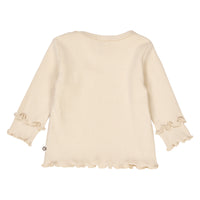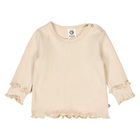 Müsli langærmet bluse i blød og strækbar rib. Blusen har fine ruflede detaljer ved ærmeafslutning og er sød og feminin i sit udtryk. Fremstillet i blød og strækbar 2x2 bomulds rib med elastan.