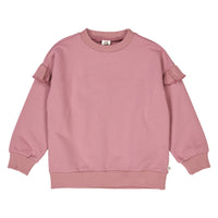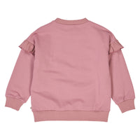 Müsli sweatshirt i en dejlig blød kvalitet med de sødeste flæser på ærmerne. Trøjen er behagelig og løs i pasformen. Udført i en smuk støvet rosa farve Fremstillet i blød og lun 100% bomulds sweat med børstet inderside for at gøre dem trøjen lun og behagelig at have på.