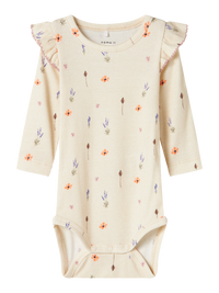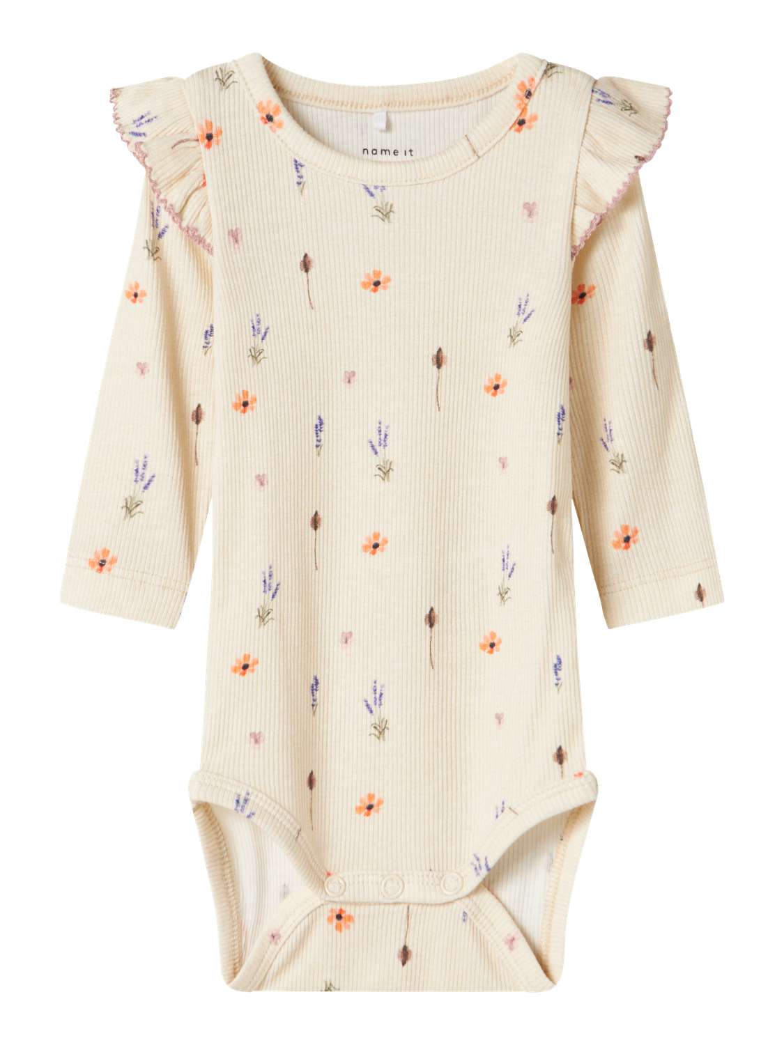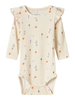 Blød og praktisk body med lange ærmer, rund halsudskæring og trykknaplukning, der gør det nemt at tage tøjet af og på. Den har et mønster med små flæsedetaljer, som giver et feminint touch. Ribstrikdesignet bidrager med god strækbarhed og komfort, perfekt til de helt små babyer.