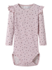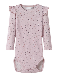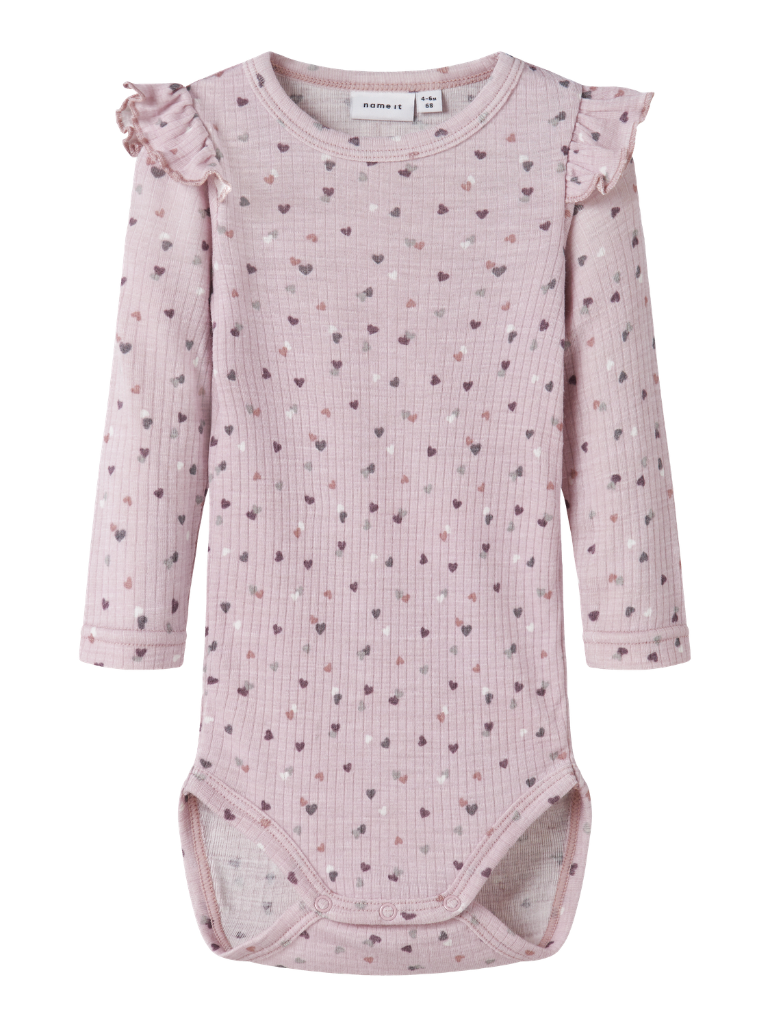 Name it bodystocking til baby er lavet med en blød blanding af 60% merinould og 40% modal, hvilket sikrer både varme og komfort. Uldens åndbare egenskaber hjælper med at stabilisere kroppens temperatur, mens modalen tilføjer en glat og behagelig overflade. Bodystockingen har lange ærmer og en rund hals, og lukkes praktisk med trykknapper i skridtet. Detaljer som flæser giver et charmerende præg, og det hele er dækket af et ensartet print over stoffet.