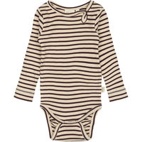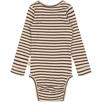 Denne bodystocking har lange ærmer og en ribstrikket, stribet tekstur, der skaber et blødt og komfortabelt udtryk. Fremstillet i en økologisk blanding af bomuld, modal og elastan, der sikrer en smidig og behagelig pasform. Farvekombinationen dark grape og off white tilføjer et elegant og subtilt look.
