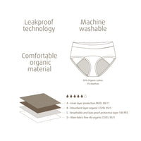 Müsli har lavet disse flotte og praktiske menstruationstrusser i dejlig blød bomulds rib med elastan. De menstruationstrusser er vaskbare og genanvendelige. De er lavet i en blød og behagelig bomuldsjersey, i 95% økologisk bomuld og 5% lycra, med en god komfort. Menstruationstrussen holder både på blødning, sekretioner og intim sved.