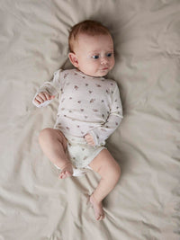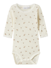 This bodysuit in soft merino wool is perfect for the little ones. It has long sleeves and a round neck, which provides a comfortable fit all day long. The special needle drop design creates unique patterns with dropped stitches, which gives a sweet and stylish look. The bodysuit closes conveniently with snaps in the crotch, which makes it easy to change diapers without hassle. It is designed in a bright white shade with small flowers, which creates a fine and delicate expression.