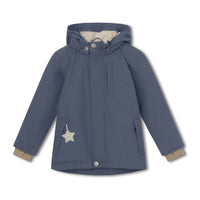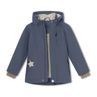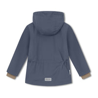 MINI A TURE Aden softshell jacket with practical side pockets. Removable hood with snaps and adjustable waist for optimal fit. MINI A TURE star reflector is found in the pocket, and the jacket has a smaller reflective logo on the back. The softshell material consists of three different layers, which are combined into one piece of fabric - an outer material, a membrane that makes the material windproof and water-repellent, and a soft fleece backing. The jacket does not have taped seams, but the material is highly water-repellent.