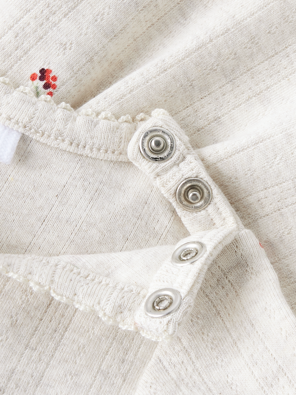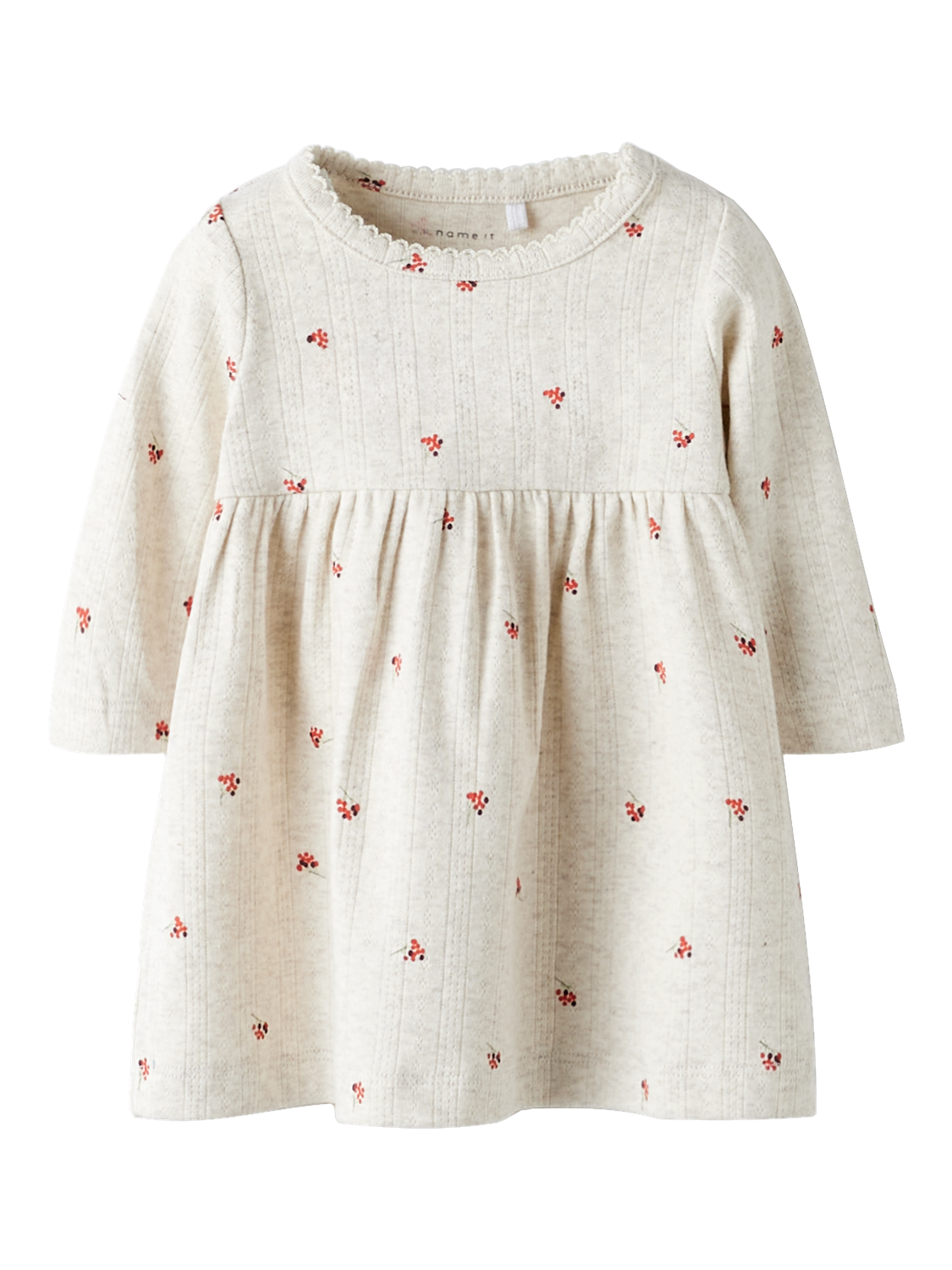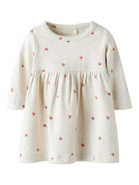 En sød og behagelig kjole til den nyfødte med lange ærmer og rund hals, der sikrer en god pasform uden at genere. Kjolen har trykknapper ved skulderen, som gør det nemt at klæde barnet på og af. Den fine peyote melange farve giver et blødt udtryk, der passer til mange anledninger og årstider.