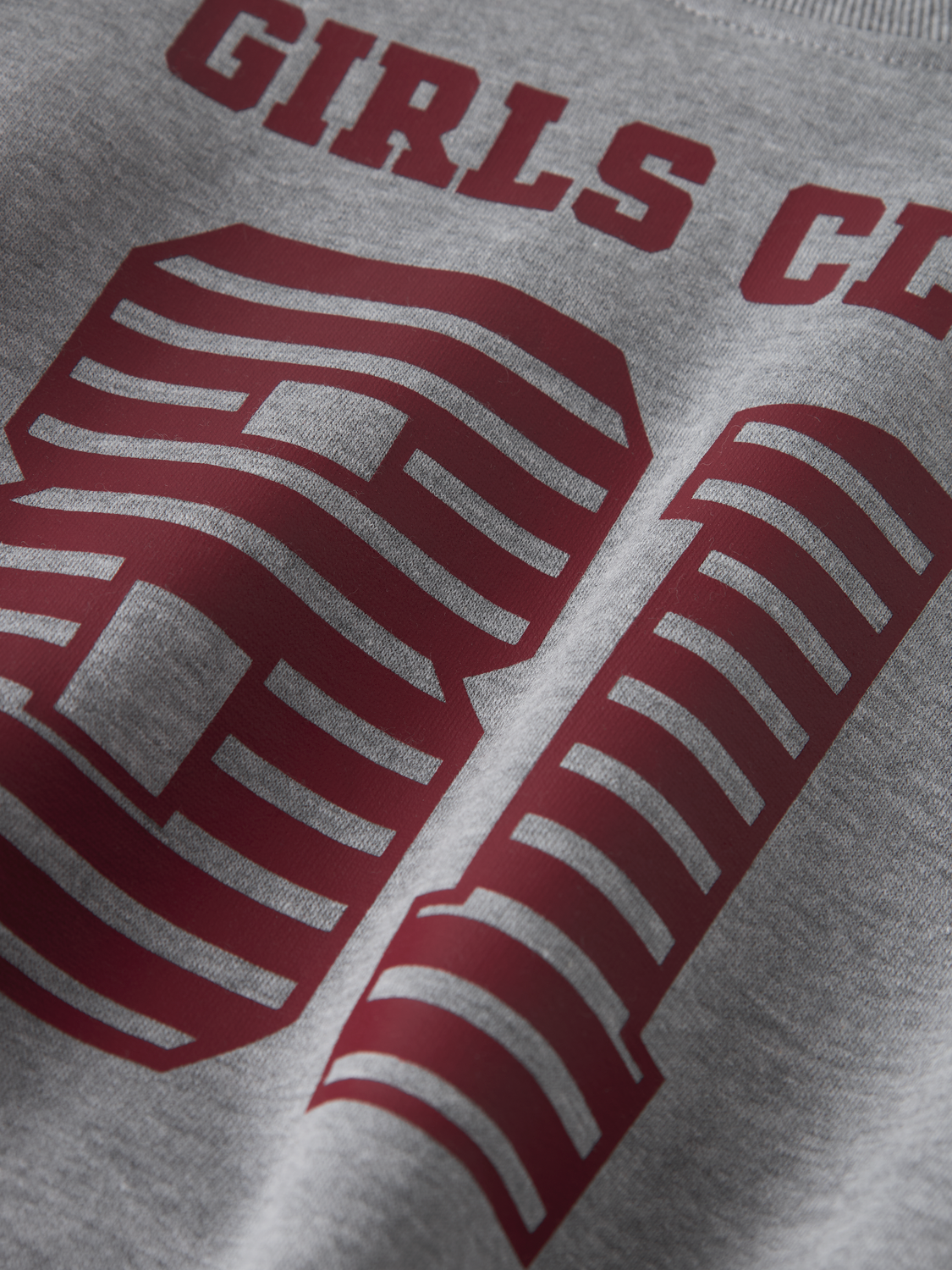 Denne korte sweatshirt i grå melange er fremstillet i blød økologisk bomuld, hvilket sikrer både komfort og bæredygtighed. Modellen har en afslappet pasform og en blød børstet inderside, som gør den behagelig at have på hele dagen. Den runde hals og lange ærmer giver et klassisk look, der passer perfekt til både leg og hverdag.