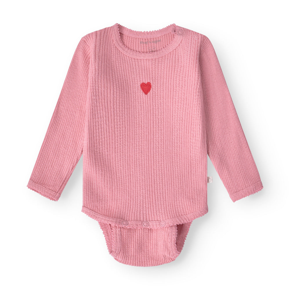 Denne bodystocking til piger er lavet i blød og behagelig økologisk bomuld, som sikrer komfort hele dagen. Den har et smukt broderet mønster, der giver et let og delikat udtryk, perfekt til både hverdag og særlige anledninger.