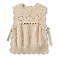 Denne fine strikkede vest er lavet i en blød blanding af 85% økologisk bomuld og 15% uld, hvilket sikrer både komfort og varme. Vesten har et enkelt og tidløst design, som gør den velegnet til både hverdag og mere afslappede lejligheder.