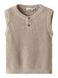 Denne strikkede vest i en blød, åben strik giver en behagelig pasform til dit barn. Vesten har en klassisk grandad-krave og er uden ærmer, hvilket gør den let og nem at kombinere med andre lag til de køligere måneder. Lukningen med knapper sikrer en nem på- og aftagning, og det organiske bomuldsmateriale bidrager til både komfort og bæredygtighed.