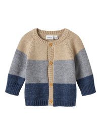 Name it strikkede cardigan er designet til nyfødte drenge og kombinerer blødhed og varme med et tidløst udtryk takket være den flade strik. Cardiganen har lange raglanærmer, en rund halsudskæring og ribkanter ved ærmerne, som giver en god pasform. Knappelukningen foran gør den nem at tage af og på, hvilket gør den praktisk til hverdagsbrug. Farven Insignia Blue giver et klassisk, stilfuldt look i en dyb blå nuance.