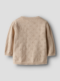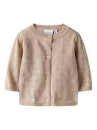 Name it strikkede cardigan byder på en blød og behagelig pasform, ideel til de små. Den har en rund halsudskæring og lange ærmer med ribstrikkede manchetter, som sikrer en god pasform omkring håndleddene. Det let glitrende design i kombination med ribafslutningen giver et elegant og stilfuldt udtryk. Cardiganen er lavet af en blanding af bomuld og metalliske fibre, som tilsammen skaber en både behagelig og dekorativ overflade.