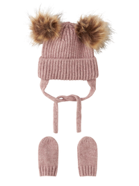 Name it strikkede sæt i en varm woodrose-farve er designet til at holde de mindste varme og komfortable. Sættet har fine pomponer, som giver et blødt og hyggeligt udtryk, og det er lavet af en blanding af genanvendt polyester, akryl og viskose, som tilsammen sørger for både holdbarhed og blødhed.
