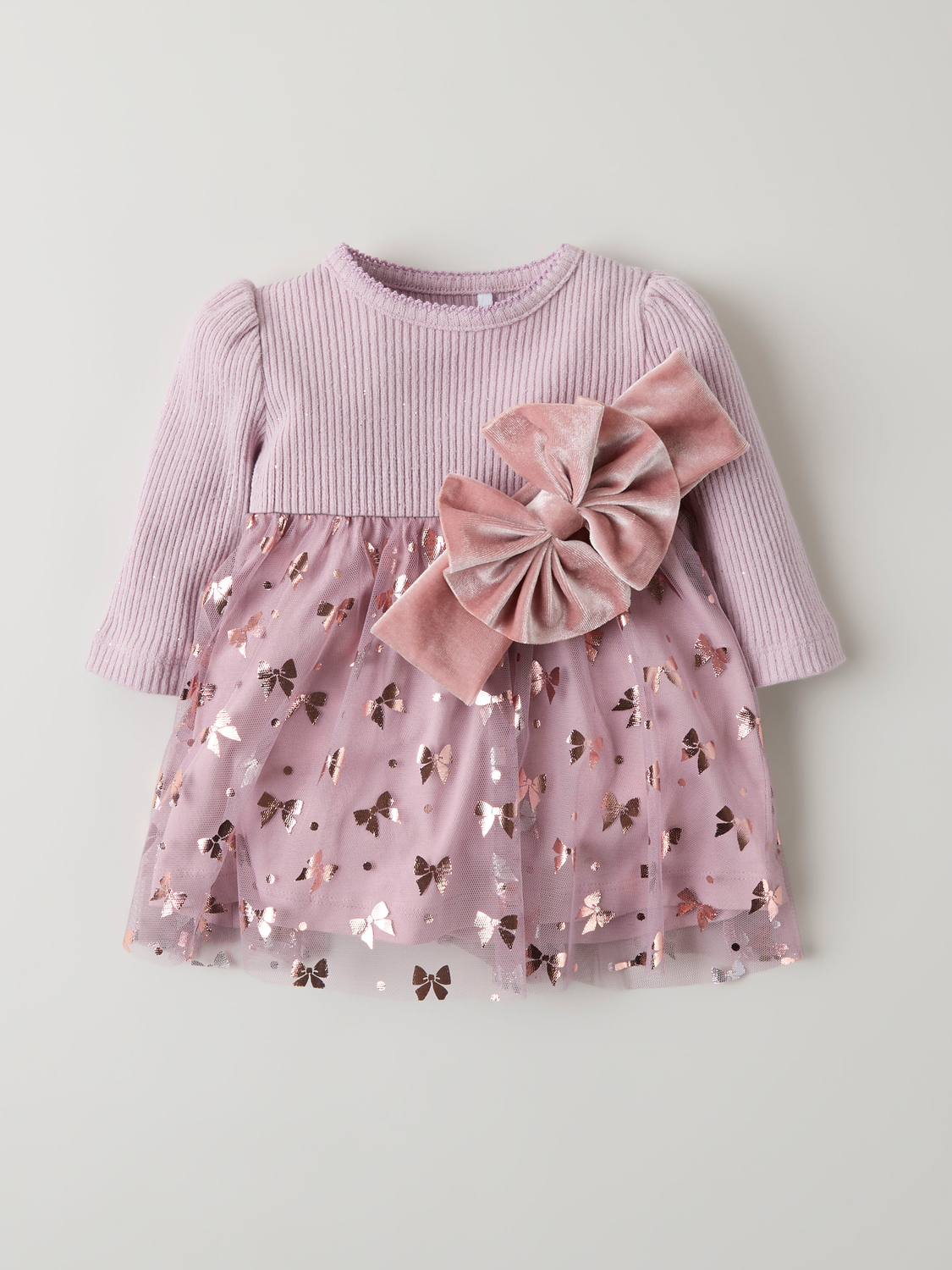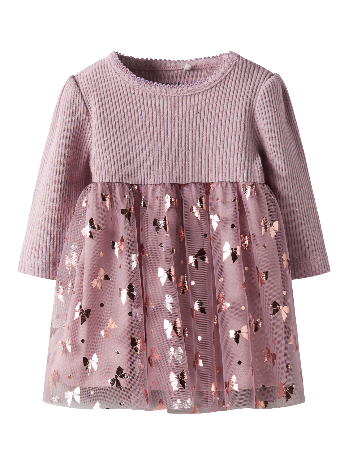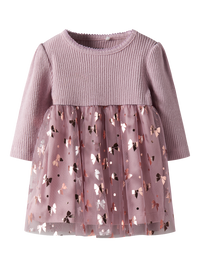 Name it kjole med en rund halsudskæring og lange ærmer, som sikrer en god pasform med en regulær fit. Den er fremstillet i en ribstrikket kvalitet med en let stribet tekstur, der giver god elasticitet og komfort. Detaljer som tyl pryder kjolen og tilføjer et fint touch til det tidløse design, der er velegnet til den kolde sæson.