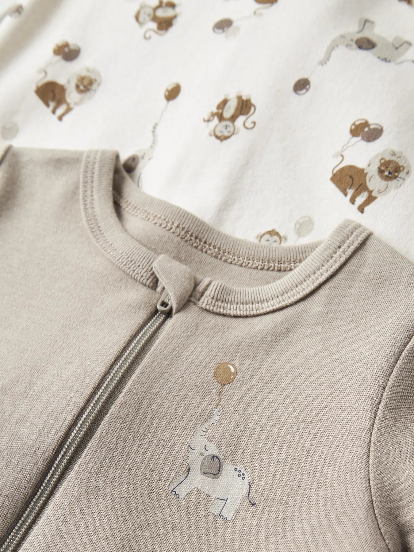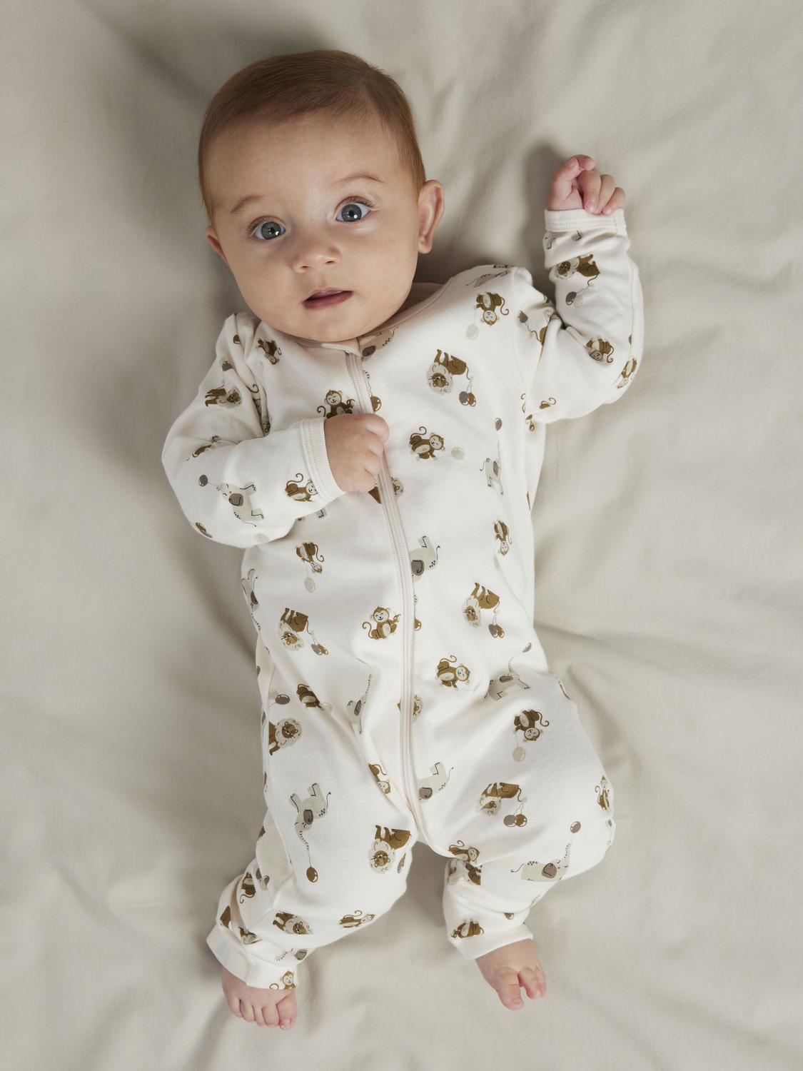 Denne natdragt til babyer er fremstillet i et blødt og behageligt interlock-stof, som er dobbeltlagret med en glat overflade og god strækbarhed, der sikrer optimal komfort. Materialesammensætningen indeholder mindst 50% økologisk bomuld, hvilket gør den både blid mod huden og mere bæredygtig. Dragten har lange ærmer og lukkes nemt med en lynlås, hvilket gør påklædningen enkel. Med et sødt dyreprint over hele stoffet og en smart to-pak får du både funktionalitet og stil til din lille ny.