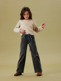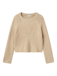 Name it  striktrøje byder på en løs pasform med rund hals og lange ærmer, der er afsluttet med ribstrikkede manchetter og en ribkant forneden. Den er fremstillet i en blød og tidløs fladstrik, som sikrer komfort og varme på kølige dage og nætter. Trøjen består af en kombination af 74% genanvendt polyester og 26% polyester, hvilket bidrager til et mere bæredygtigt valg.