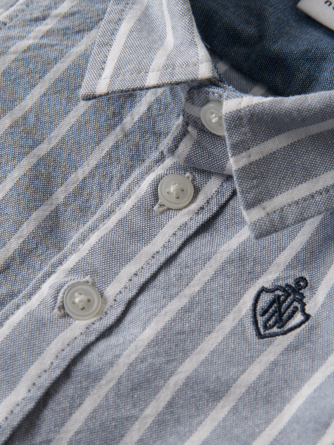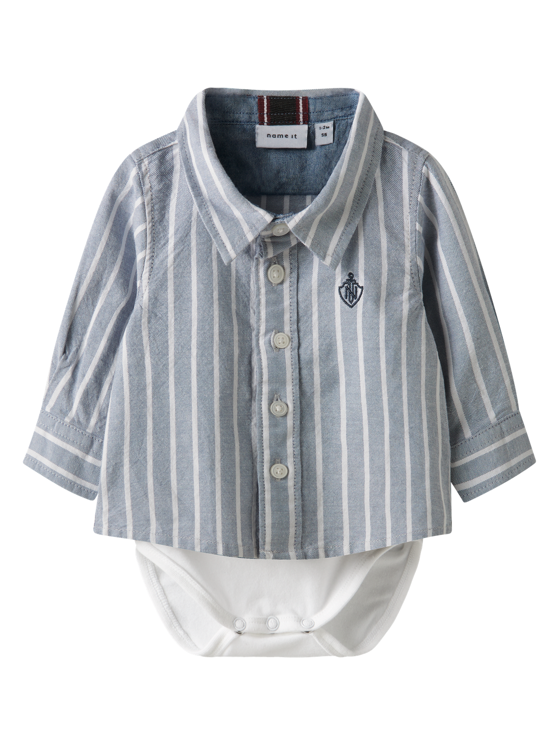 Name it skjortebody til nyfødte kombinerer et klassisk oxford-vævet stof, som byder på en tekstureret overflade og et tidløst udtryk. Den er skabt i en behagelig og praktisk stil med lange ærmer og krave, hvilket gør den ideel til de kølige vintermåneder. Lukningen med trykknapper sikrer nem på- og afklædning, mens den regulære pasform giver god bevægelsesfrihed.
