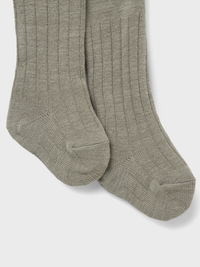 Name it ribstrikkede strømpebukser i en afdæmpet farve, kaldet Dried Sage, kombinerer komfort og funktionalitet til de mindste. Materialeblandingen med 50% merinould og 30% bomuld sikrer blødhed og naturlig varme, samtidig med at polyamid og elastan giver god pasform og bevægelsesfrihed. Uldens termiske egenskaber hjælper med at holde en stabil kropstemperatur, uanset årstiden, hvilket gør disse strømpebukser ideelle til både hverdag og særlige anledninger.