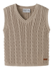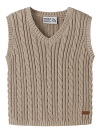 Name it strikvest er lavet i en blød kabelstrik, der giver både komfort og et hyggeligt udseende. Den har en v-udskæring og er ærmeløs, hvilket gør den velegnet som et lag-på-lag stykke til den mindste i familien. Med sit regelrette fit og ribkant ved nederste kant sikrer vesten en behagelig pasform og et enkelt, tidløst look.