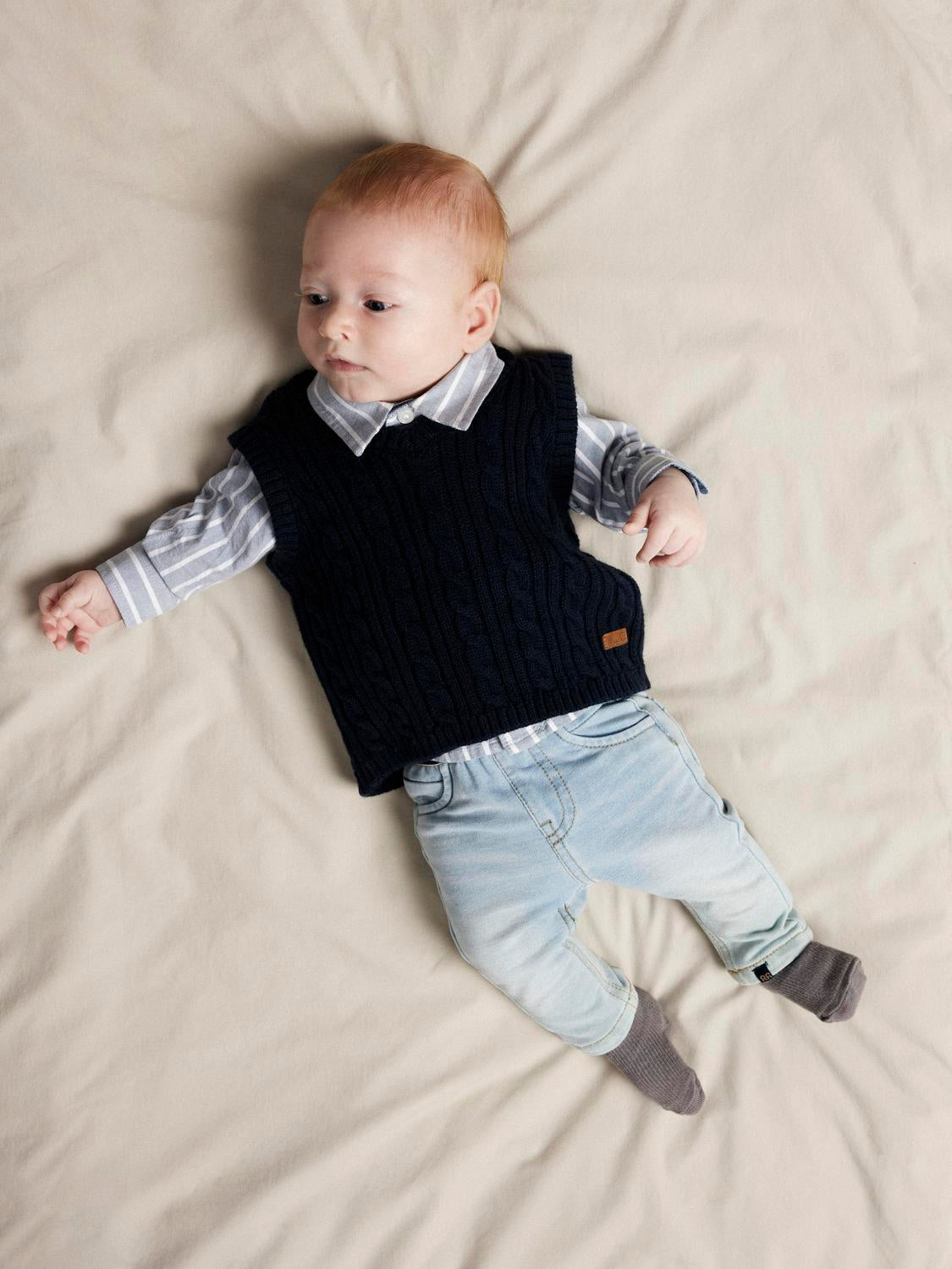 Name it strikkede slipover er designet til nyfødte og kombinerer en blød og behagelig ribstrik med en klassisk V-hals. Slipoveren har en regular fit pasform, som sikrer komfort uden at gå på kompromis med stilen. Den mørkeblå nuance giver et tidløst og alsidigt look, velegnet til vintermånederne. Det naturlige materiale føles blødt mod huden og gør slipoveren til et ideelt valg til hverdagsbrug.
